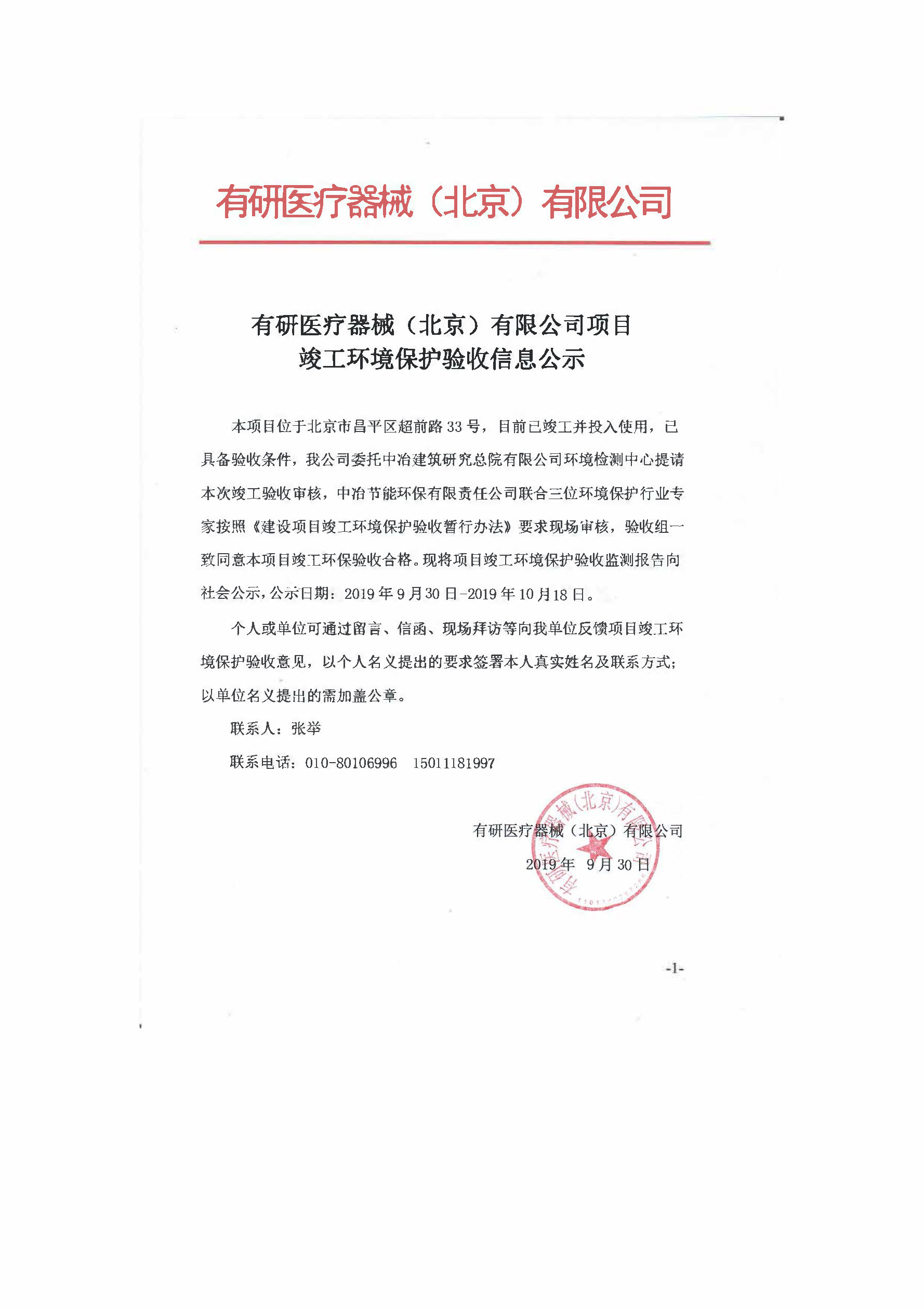 有研醫(yī)療器械(北京)有限公司項目竣工環(huán)境保護(hù)驗收信息公示...